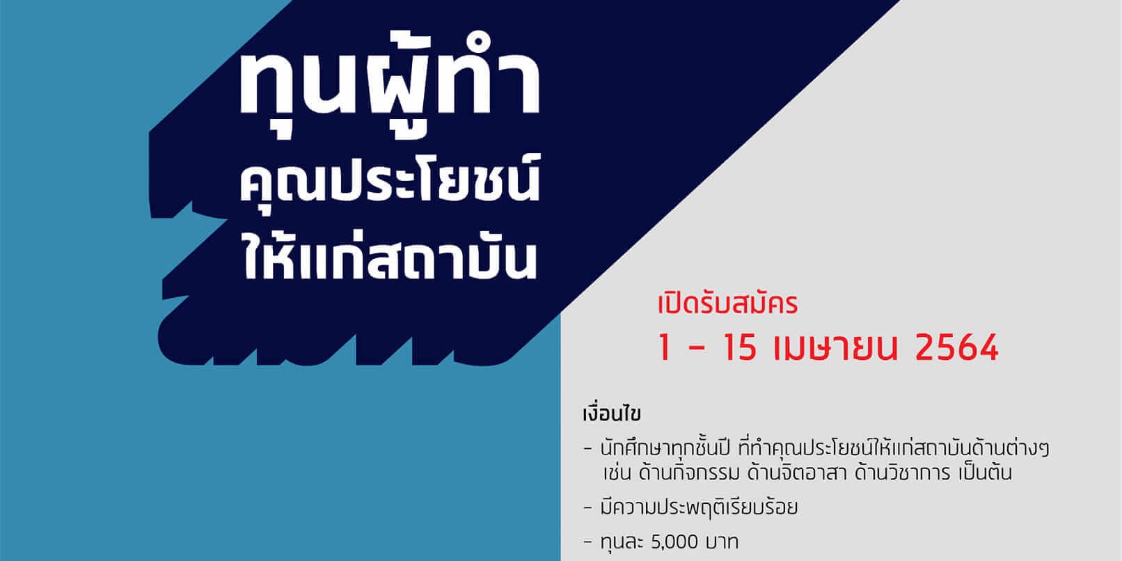 Apr22021Student เปิดรับสมัคร ทุนผู้ทำคุณประโยชน์ให้แก่ สถาบัน (ทุนนักกิจกรรม) 📆เปิดรับสมัคร 1-15 เมษายน 2564 สมัครตาม Link รายละเอียดเพิ่มเติมด้านล่างนี้ค่ะ Category: StudentBy chakrit ThienthongApril 2, 2021Tags: Student Author: chakrit Thienthong Related Postsขั้นตอนการลงทะเบียนเรียน ในปีการศึกษา 1/2567June 28, 2024สจล. คว้าอันดับ 1 มหาวิทยาลัยรัฐที่นักเรียนไทยใฝ่ฝันJune 27, 2024นักศึกษาชั้นปีที่ 1 รอรับ Username และ Password สำหรับเข้าใช้งานระบบสารสนเทศนักศึกษา ทาง EMAIL นักศึกษาJune 27, 2024จัดโครงการ K-Engineering Preparation Camp 2024 เพื่อต้อนรับน้องๆ นักศึกษาใหม่June 26, 2024ภาควิชาวิศวกรรมเคมี #วิศวลาดกระบัง จัดกิจกรรม PRE CHEM KMITL #11June 26, 2024Interns at TP, SingaporeJune 26, 2024