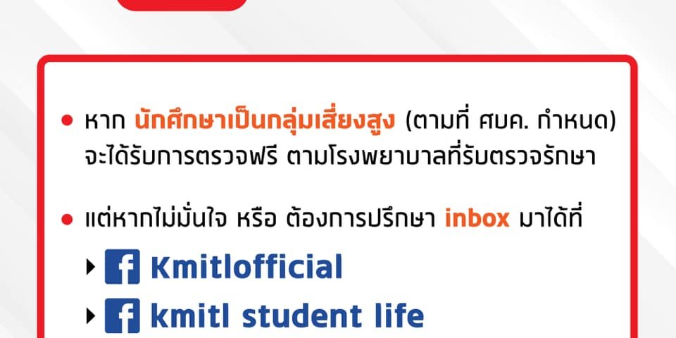เนื่องจากสถานการณ์การแพร่ระบาดของโรค Covid-19 ในปัจจุบัน หากนักศึกษาเป็นกลุ่มเสี่ยงสูง (ตามที่ ศบค. กำหนด) จะได้รับการตรวจฟรี ตามโรงพยาบาลที่รับตรวจรักษา แต่หากไม่มั่นใจ หรือ ต้องการปรึกษา inbox มาได้ที่เพจKMITL และ KMITL Student Life