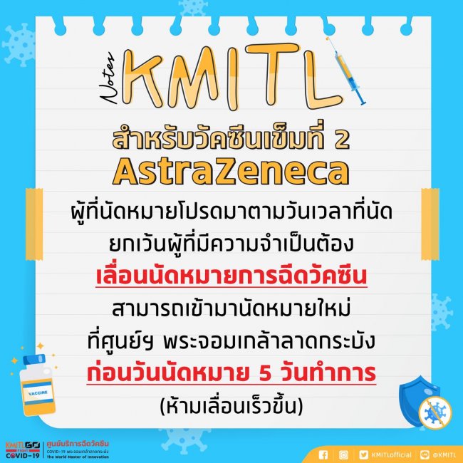 ผู้ที่เข้ารับการฉีดวัคซีน AstraZeneca เข็ม2 โปรดมาตามวันเวลานัดหมาย
