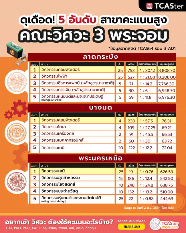 5 อันดับ คะแนนสอบเข้าสูง จากคณะวิศวะ 3 พระจอมมาแรง