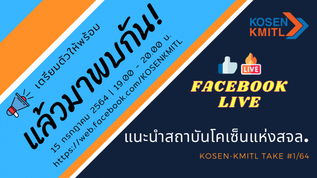 Facebook live แนะนำ KOSEN-KMITL ในวันที่ 15 กรกฎาคม 2564 นี้ เวลา 19.00 น. – 20.00 น