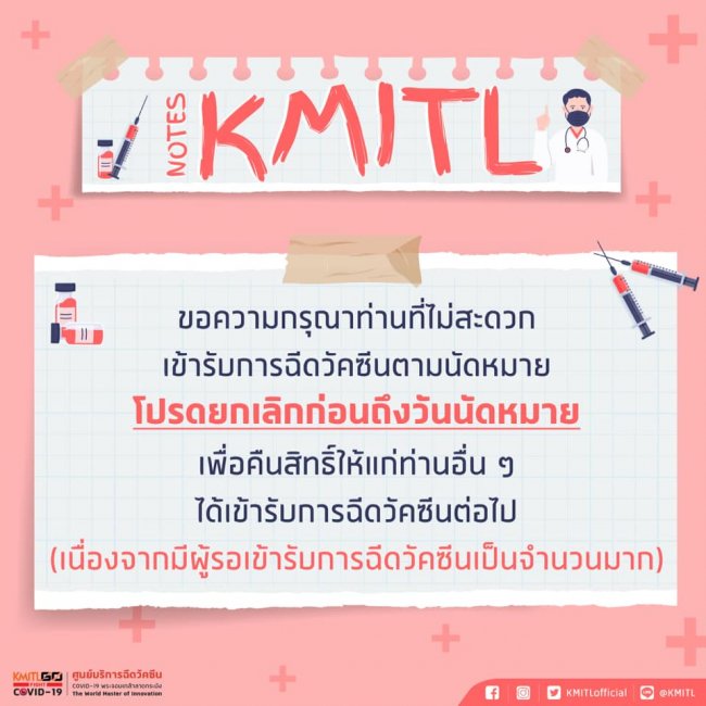 ขอความกรุณาท่านที่จองคิวไว้แล้วไม่สะดวกเข้ารับการฉีดวัคซีนตามนัดหมาย #โปรดยกเลิกก่อนถึงวันนัดหมาย