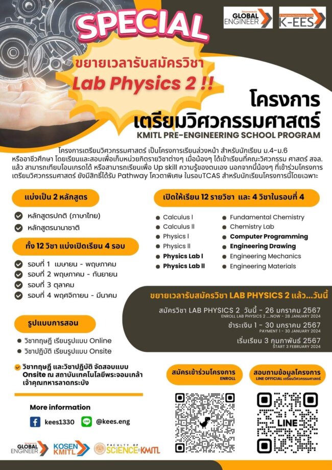 (K-EES) ขยายเวลารับสมัคร “โครงการเตรียมวิศวกรรมศาสตร์” รอบ 4 ในรายวิชา Lab Physics 2