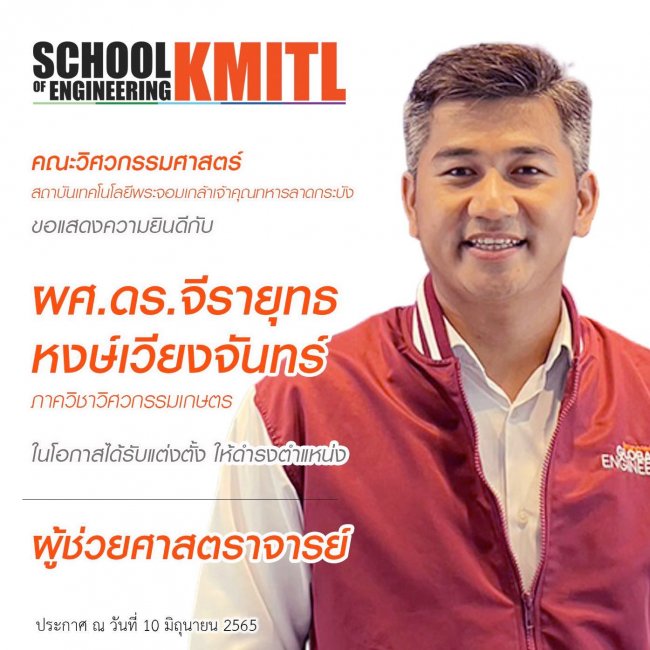ขอแสดงความยินดีกับ ผศ.ดร.จีรายุทธ หงษ์เวียงจันทร์ ภาควิชา วิศวกรรมเกษตร ในโอกาสได้รับแต่งตั้ง ให้ดำรงตำแหน่ง “ผู้ช่วยศาสตราจารย์”