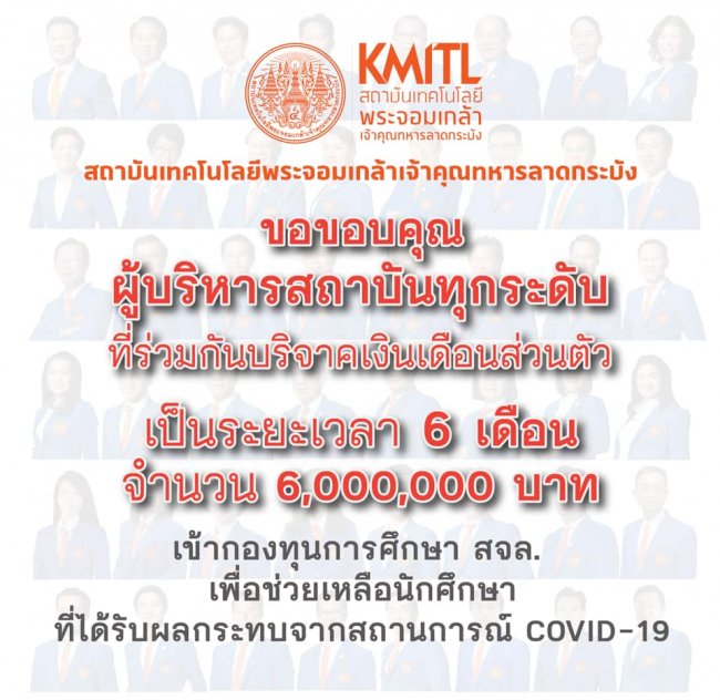 ขอขอบคุณผู้บริหารสถาบันทุกระดับ ที่ได้ร่วมกันบริจาคเงินเดือนส่วนตัว เป็นระยะเวลา 6 เดือน