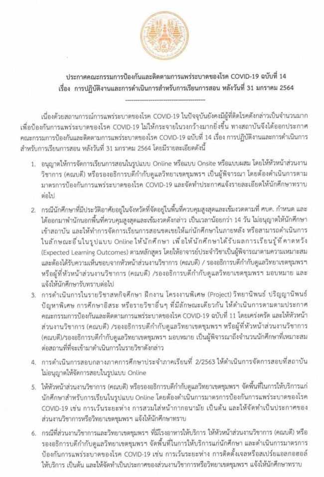 ประกาศคณะกรรมการป้องกันและติดตามการแพร่ระบาดของโรค COVID-19 ฉบับที่ 14