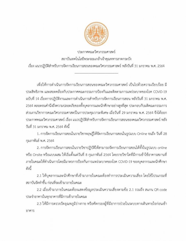 แนวปฏิบัติสำหรับการจัดการเรียนการสอน ของคณะวิศวกรรมศาสตร์ หลังวันที่ 31 ม.ค. 2564