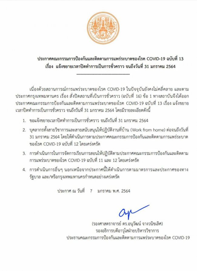 แจ้งปิดทำการเป็นการชั่วคราว จนถึงวันที่ 31 มกราคม 2564