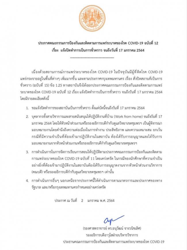 แจ้งปิดทำการเป็นการชั่วคราว ตามประกาศกรุงเทพมหานคร เรื่อง สั่งปิดสถานที่เป็นการชั่วคราว