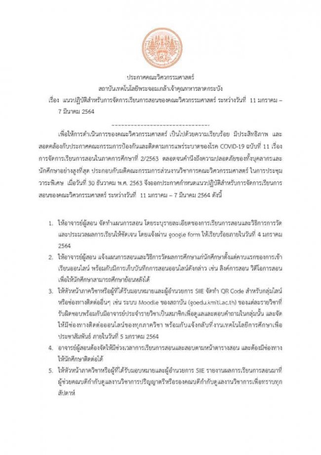 แนวปฏิบัติสำหรับการจัดการเรียนการสอนของคณะวิศวกรรมศาสตร์ ภาคเรียนที่ 2/2563
