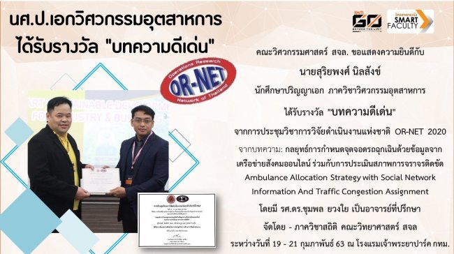 นักศึกษาปริญญาเอก คณะวิศวกรรมศาสตร์ สจล. ได้รับรางวัล “บทความดีเด่น” จากการประชุมวิชาการวิจัยดำเนินงานแห่งชาติ OR-NET 2020