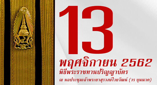 สถาบันเทคโนโลยีพระจอมเกล้าเจ้าคุณทหารลาดกระบังกำหนดจัดพิธีพระราชทานปริญญาบัตรแก่บัณฑิต พระจอมเกล้าลาดกระบังฯ ประจำปีการศึกษา 2561 ในวันที่ 13 พฤศจิกายน 2562 ณ หอประชุมเจ้าพระยาสุรวงษ์ไวยวัฒน์ (วร บุนนาค)