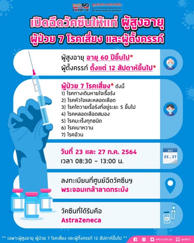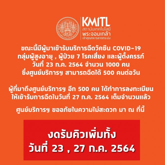 ประกาศจากศูนย์บริการฉีดวัคซีน COVID-19 พระจอมเกล้าลาดกระบัง งดรับคิวเพิ่มทั้ง วันที่ 23 , 27 ก.ค. 2564