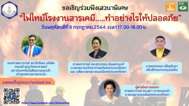 สมาคมเคมีแห่งประเทศไทยฯขอเชิญร่วมฟังเสวนาพิเศษ “ไฟไหม้โรงงานสารเคมี…..ทำอย่างไรให้ปลอดภัย