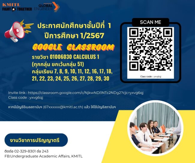 ประกาศช่องทางการติดต่อในรายวิชา Calculus 1