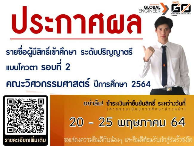 รายชื่อผู้มีสิทธิ์เข้าศึกษาระดับปริญญาตรี โควตา รอบที่2 คณะวิศวกรรมศาสตร์ ปีการศึกษา 2564