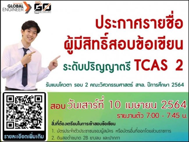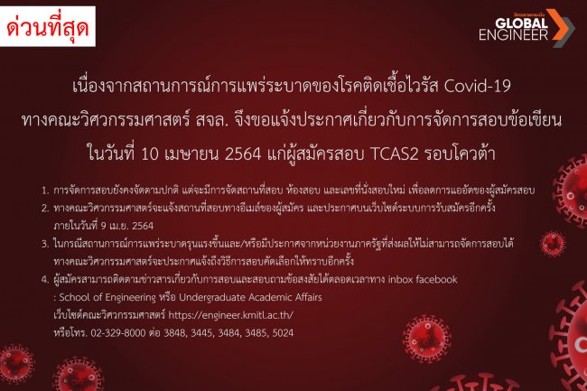 แจ้งประกาศเกี่ยวกับการจัดการสอบข้อเขียนในวันที่ 10 เม.ย.2564 แก่ผู้สมัครสอบ TCAS2 รอบโควต้า