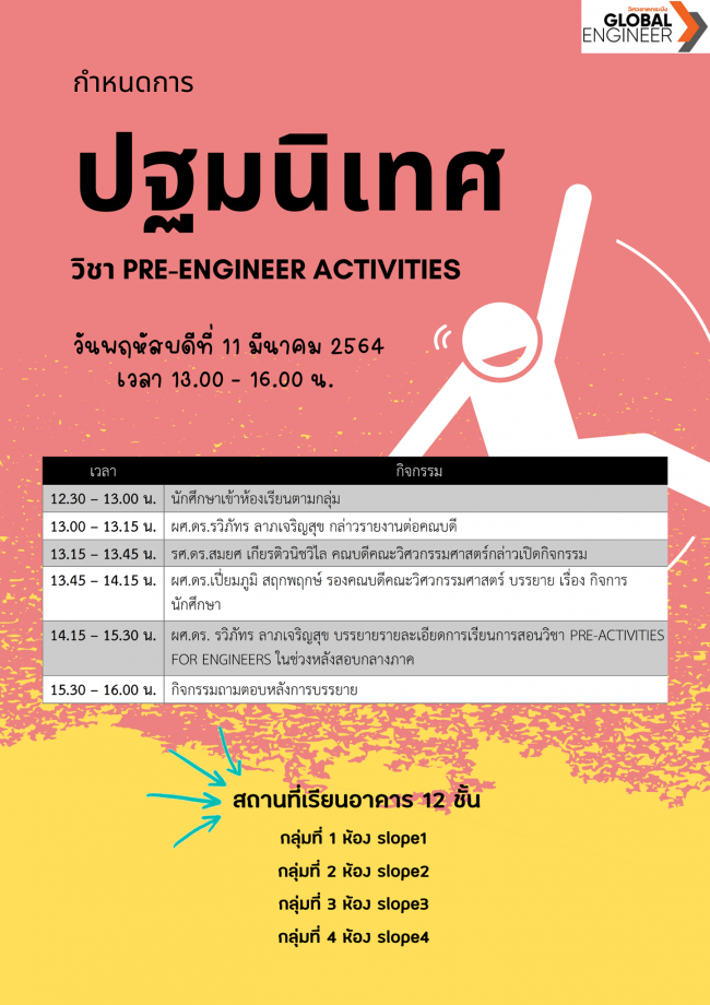 กำหนดการกิจกรรมปฐมนิเทศวิชา PRE-ACTIVITIES FOR ENGINEERS