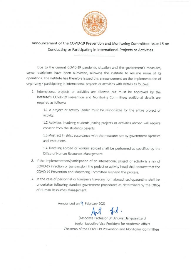 Announcement of the COVID-19 Prevention and Monitoring Committee Issue 15 on Conducting or Participating in International Projects or Activities