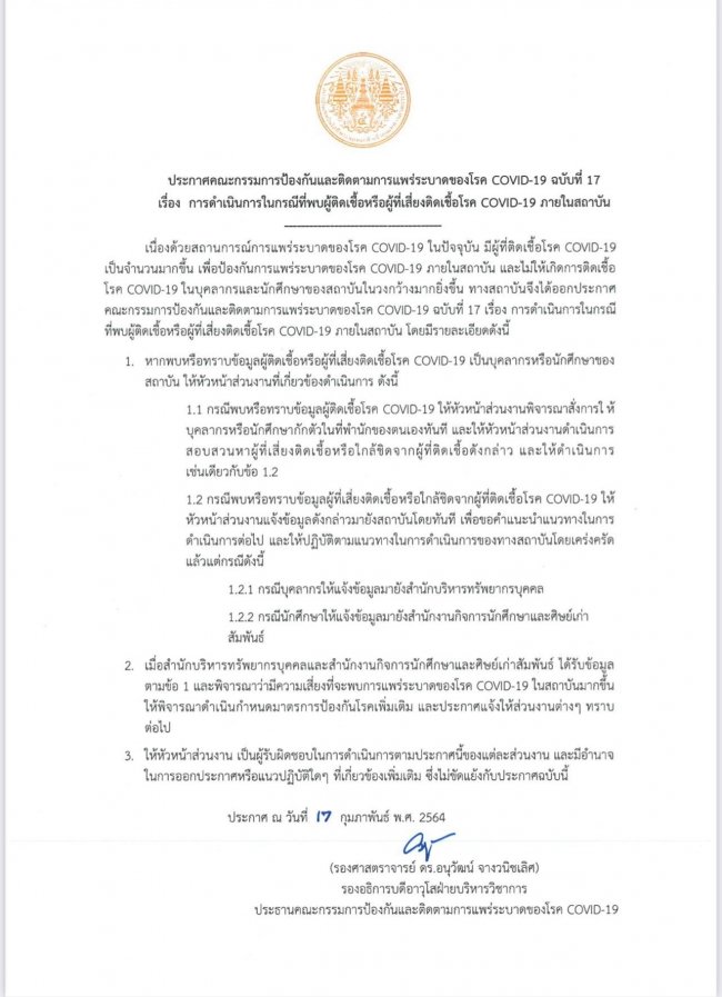 การดำเนินการในกรณีที่พบผู้ติดเชื้อหรือผู้ที่เสี่ยงติดเชื้อฯ ภายในสถาบัน
