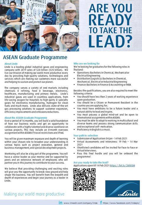 บริษัท ลินเด้ (ประเทศไทย) จำกัด (มหาชน) มีโครงการเปิดรับสมัครนักศึกษาจบใหม่