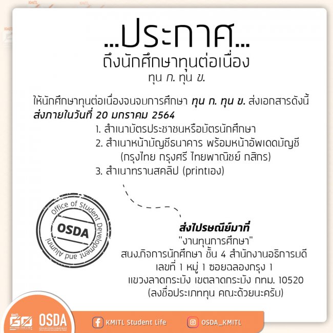 นักศึกษาทุนต่อเนื่อง ทุน ก. ทุน ข ส่งเอกสารภายในวันที่ 20 ม.ค. 2564