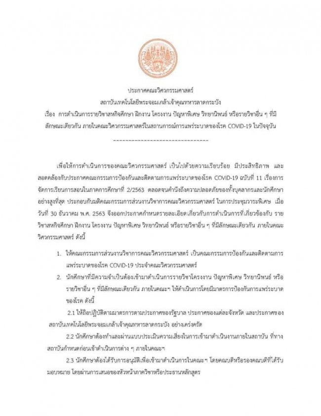 การดำเนินการรายวิชาสหกิจศึกษา ฝึกงาน โครงงาน ปัญหาพิเศษ วิทยานิพนธ์ หรือรายวิชาอื่น ๆ