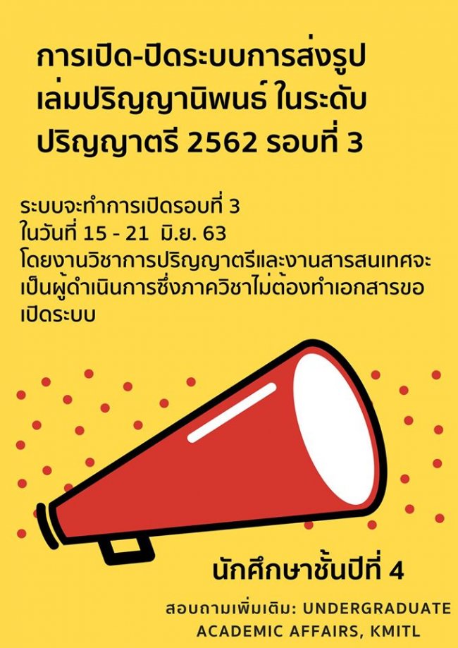 การเปิด-ปิดระบบการส่งรูปเล่มปริญญานิพนธ์ ในระดับปริญญาตรี 2562 รอบที่ 3