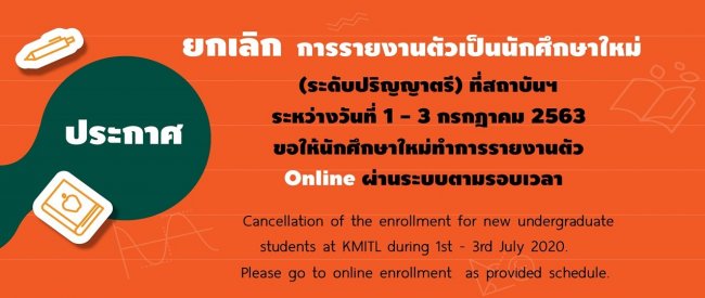 ยกเลิก การรายงานตัวนักศึกษาใหม่ ระดับปริญญาตรี ที่สถาบันฯ ระหว่างวันที่ 1-3 กรกฎาคม 2563