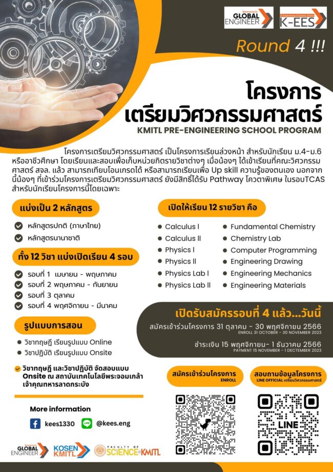 ศูนย์พัฒนศึกษาวิศวกรรมศาสตร์เปิดรับสมัคร “โครงการเตรียมวิศวกรรมศาสตร์” รอบ 4 แล้ววันนี้