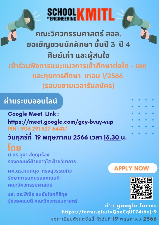 ขอเชิญชวนนักศึกษา ชั้นปี 3 ปี 4 ศิษย์เก่าและผู้สนใจเข้าร่วมฟังการแนะแนวการเข้าศึกษาต่อโท-เอก และทุนการศึกษา