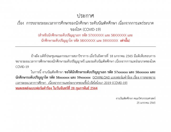 ขยายระยะเวลาการศึกษาของนักศึกษา ระดับบัณฑิตศึกษา เนื่องจากการแพร่ระบาดของโรค (COVID-19)