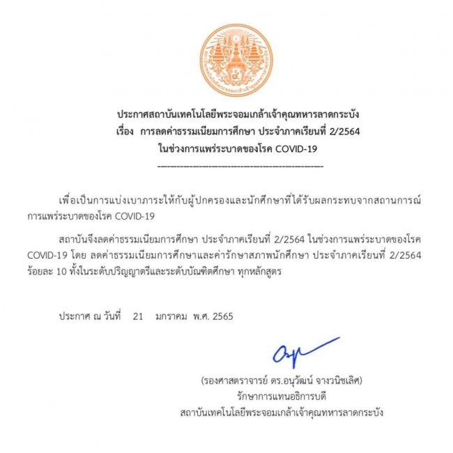 ประกาศสถาบันฯ เรื่อง การลดค่าธรรมเนียมการศึกษา ประจำภาคเรียนที่ 2/2564