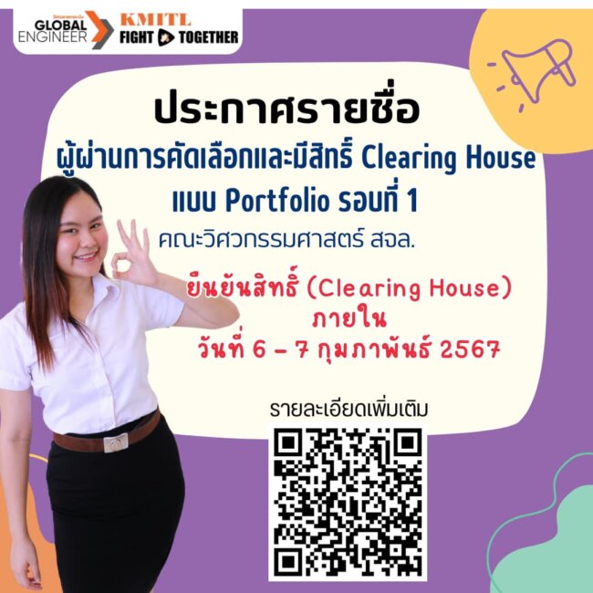 รายชื่อผู้ผ่านการคัดเลือกและมีสิทธิ์ Clearing House แบบ Portfolio รอบที่ 1