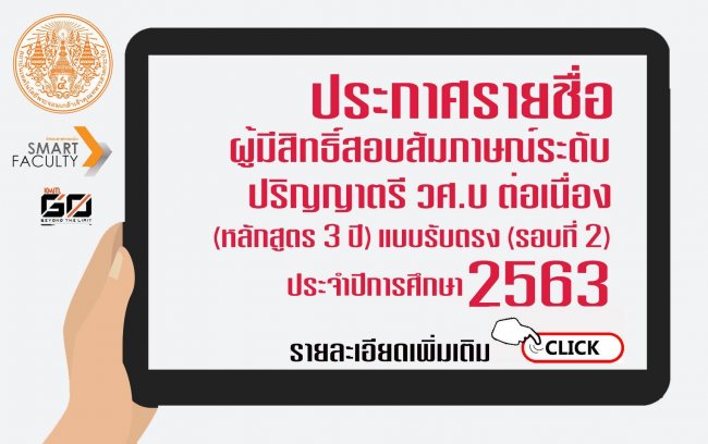ประกาศรายชื่อผู้มีสิทธิ์สอบสัมภาษณ์ระดับ ป.ตรี วศ.บ ต่อเนื่อง (หลักสูตร 3 ปี) แบบรับตรง (รอบที่2) ประจำปีการศึกษา 2563