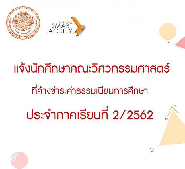แจ้งนักศึกษาคณะวิศวกรรมศาสตร์ที่ค้างชำระค่าธรรมเนียมการศึกษาประจำภาคเรียนที่ 2/2562