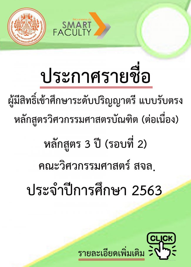 ประกาศรายชื่อผู้มีสิทธิ์เข้าศึกษาระดับปริญญาตรี แบบรับตรง หลักสูตรวิศวกรรมศาสตรบัณฑิต (ต่อเนื่อง) หลักสูตร 3 ปี (รอบที่ 2)