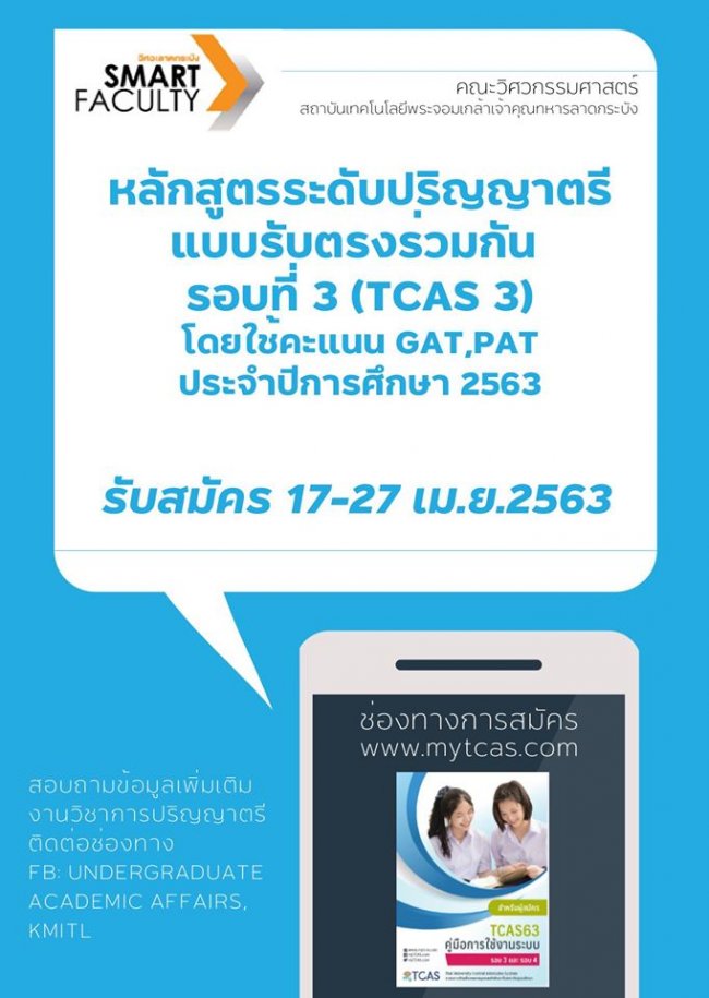 ประกาศรับสมัครบุคคลเข้าศึกษาต่อระดับปริญญาตรี แบบรับตรงร่วมกัน รอบที่ 3 (TCAS 3) โดยพิจารณาจากคะแนน GAT/PAT ประจำปีการศึกษา 2563