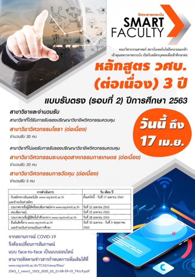 เปิดรับสมัครเข้าศึกษาต่อหลักสูตร วศ.บ ต่อเนื่อง หลักสูตร 3 ปี
