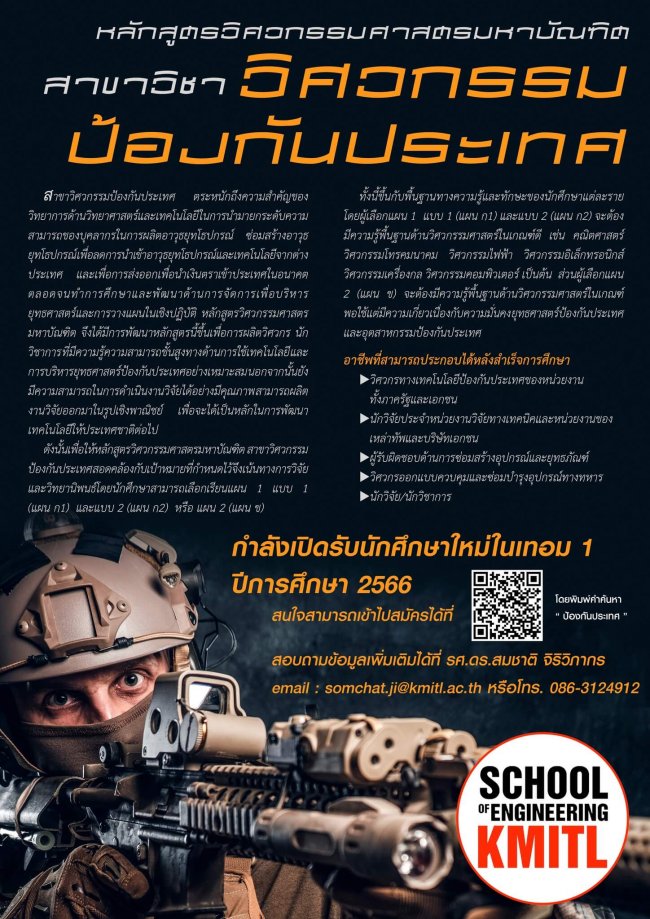 หลักสูตรวิศวกรรมศาสตรมหาบัณฑิตสาขาวิชา วิศวกรรมป้องกันประเทศ กำลังเปิดรับนักศึกษาใหม่ในเทอม 1 ปีการศึกษา 2566